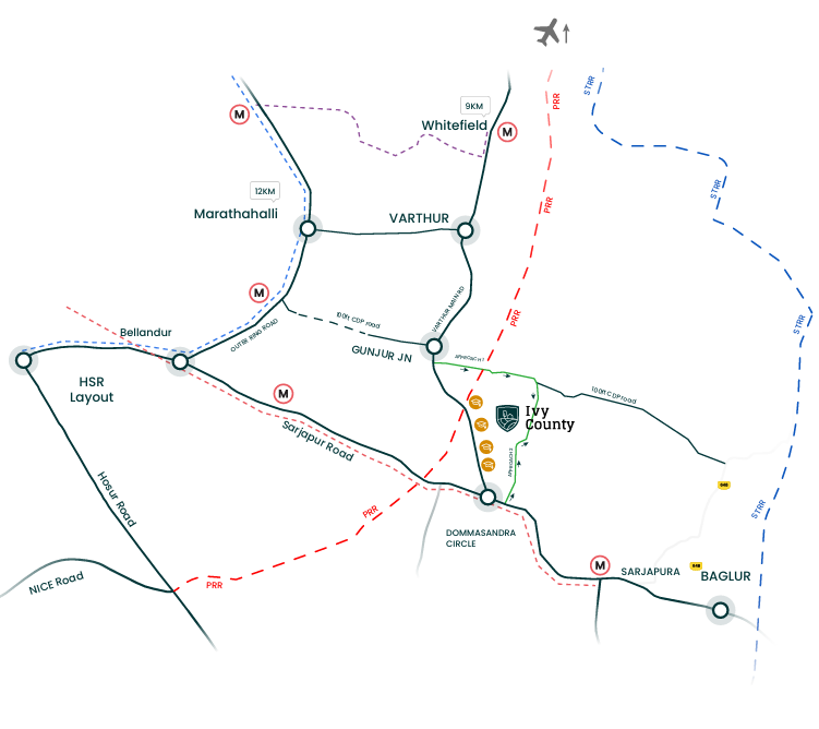 Ivy County is a visionary BDA-approved plotted development that redefines premium land ownership in East Bangalore. With a strong focus on thoughtful planning, modern infrastructure, and expansive green spaces, this landmark project offers the perfect balance of luxury, comfort, and long-term value. Nestled on Varthur–Sarjapura Road, behind Greenwood High School, Ivy County provides residents a peaceful, future-ready environment while ensuring excellent connectivity to Whitefield, Sarjapura, Marathahalli, and major IT hubs across the city.